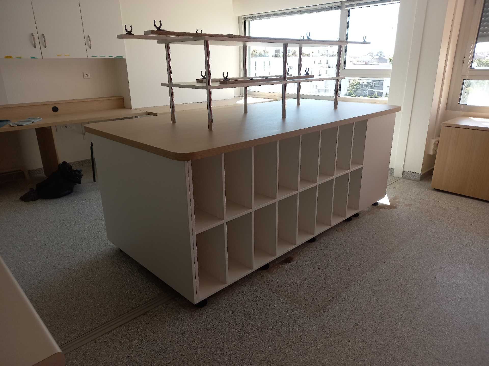 La fabrication est réalisée par une équipe de menuisiers d’atelier, Raphaël Chef Atelier, Arthur Menuisier, Antoine Apprenti menuisier.